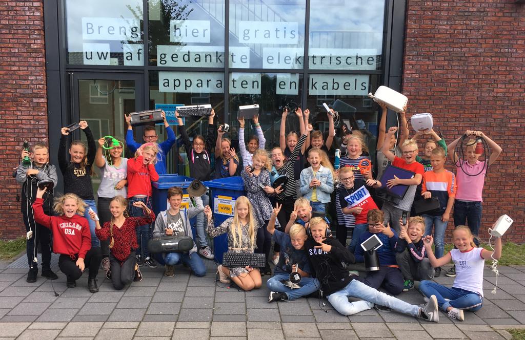 Groep 8 doet mee aan de E‑waste Race. Dit is een lesproject waarbij kinderen leren over grondstoffenschaarste, duurzaamheid en het recyclen van elektronische apparaten. In een wedstrijd